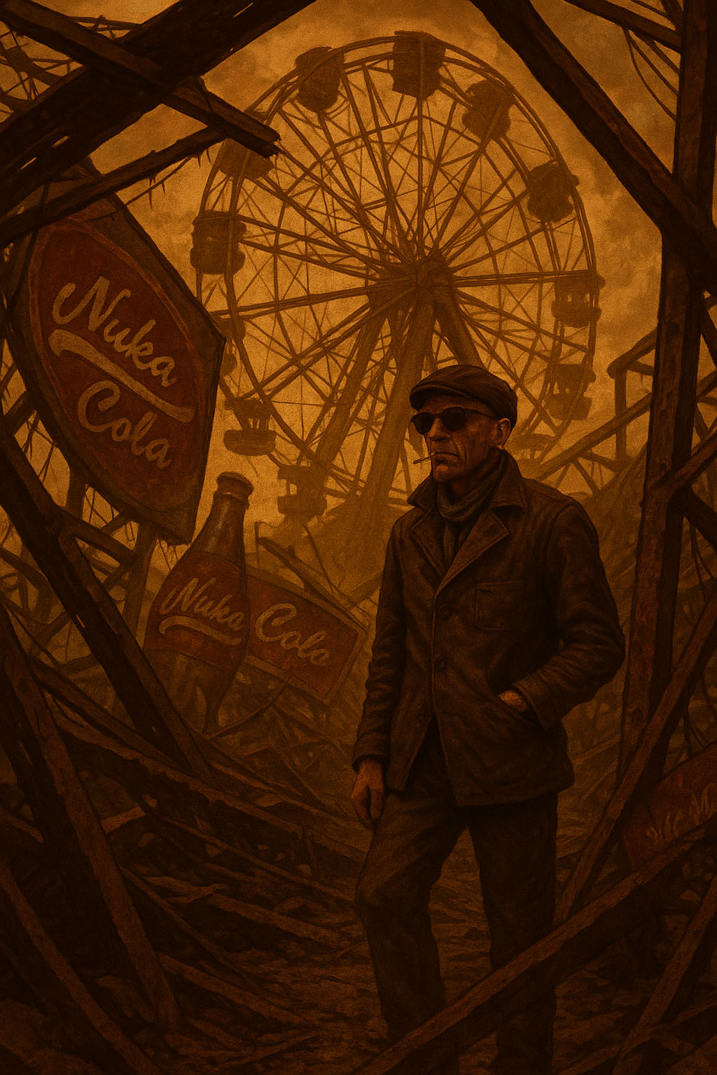 - Anuncios ficticios e identidades gráficas creadas con IA, con estética retrofuturista Fallout.